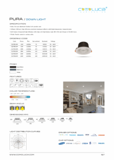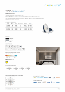Body: Die-cast aluminum finished with powder coat. Diffuser: High efficiency anodized aluminum reflector with High-transparency tempered glass cover. LED Source: Integrated high-efficiency LED chips with high lumen, high CRI (>90) and lifespan of 50,000 hours. Finish: Powder coated in various color.