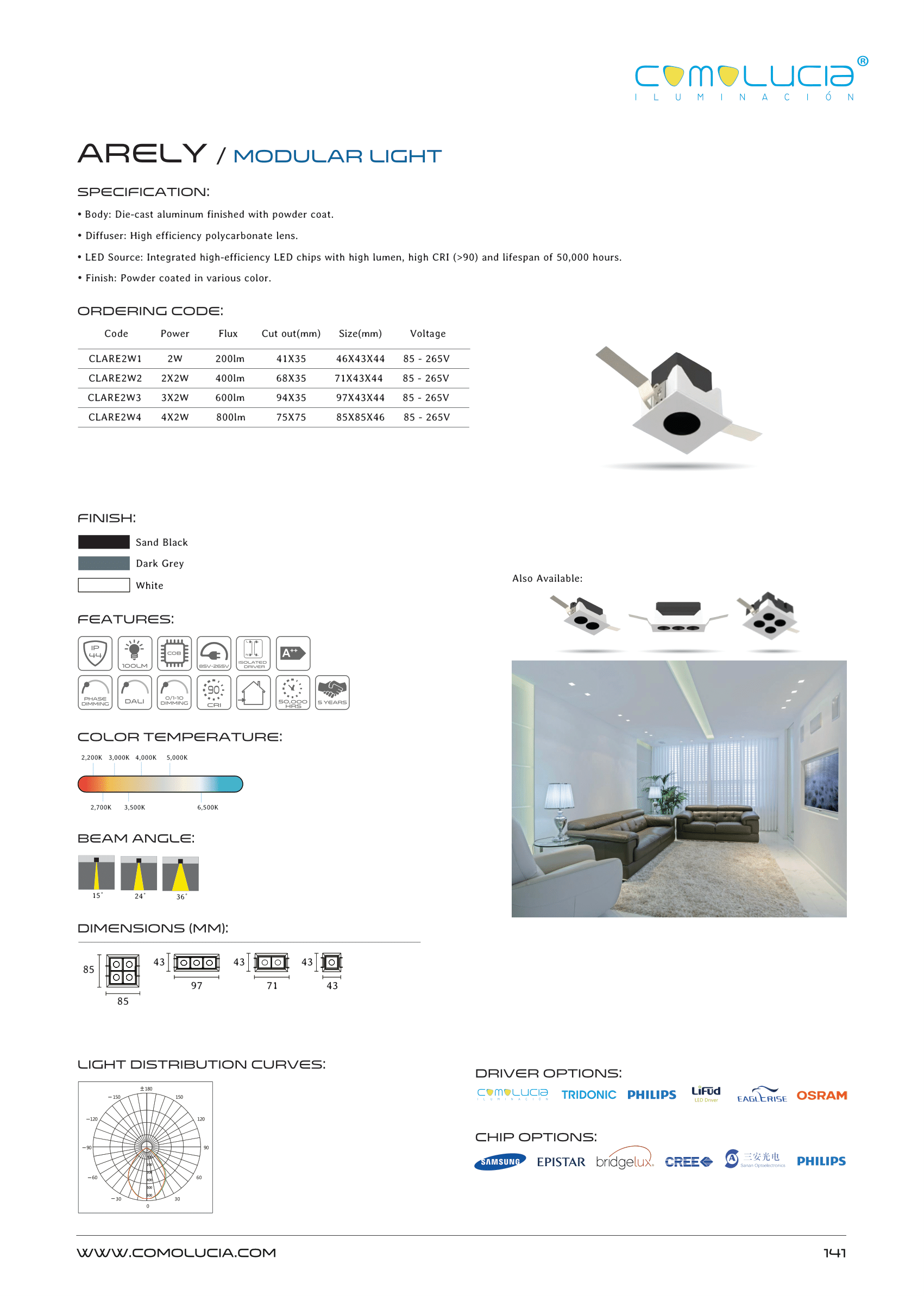 - LED Source: Integrated high-efficiency LED chips with high lumen, high CRI (>90) and lifespan of 50,000 hours.