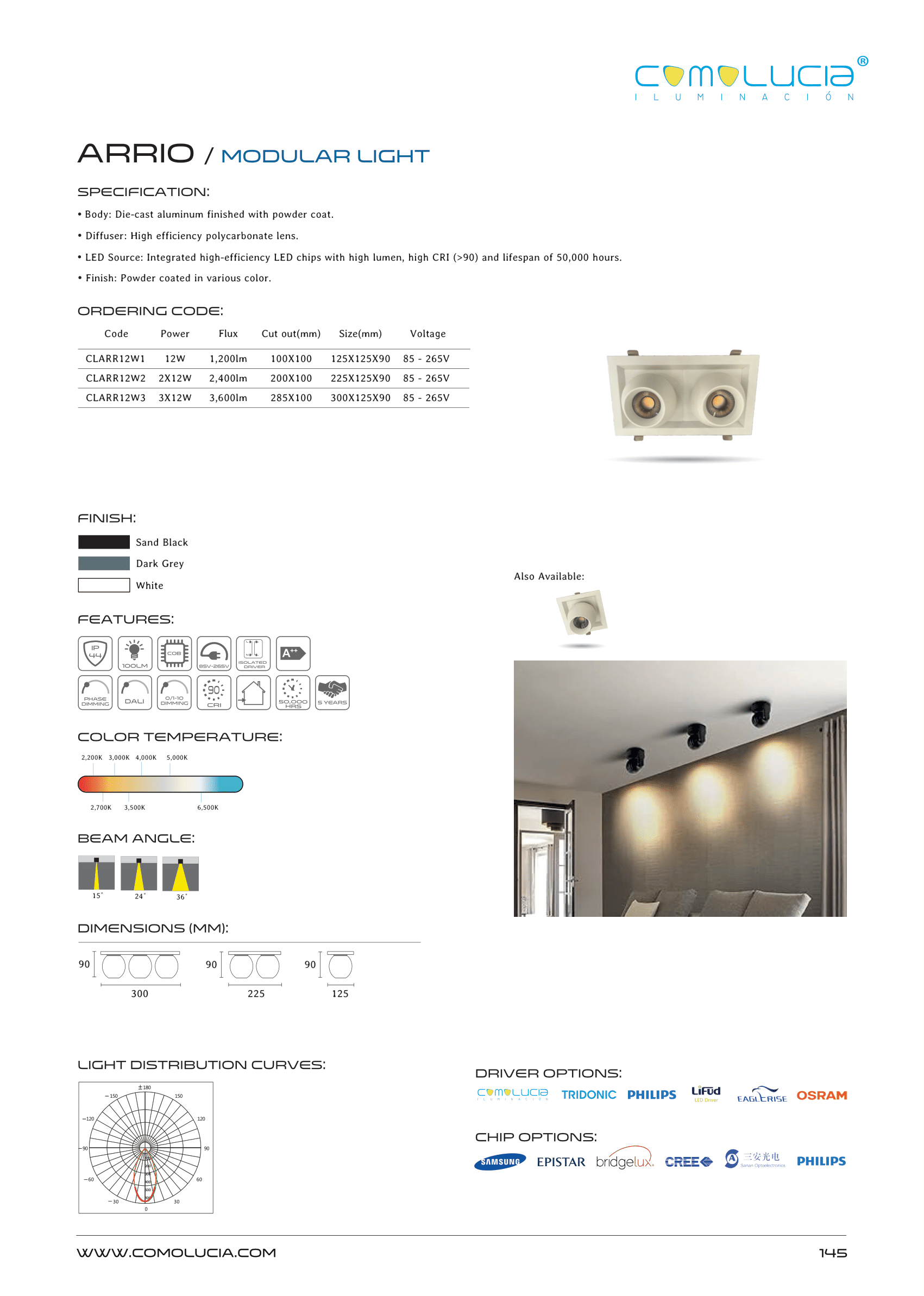 - LED Source: Integrated high-efficiency LED chips with high lumen, high CRI (>90) and lifespan of 50,000 hours.