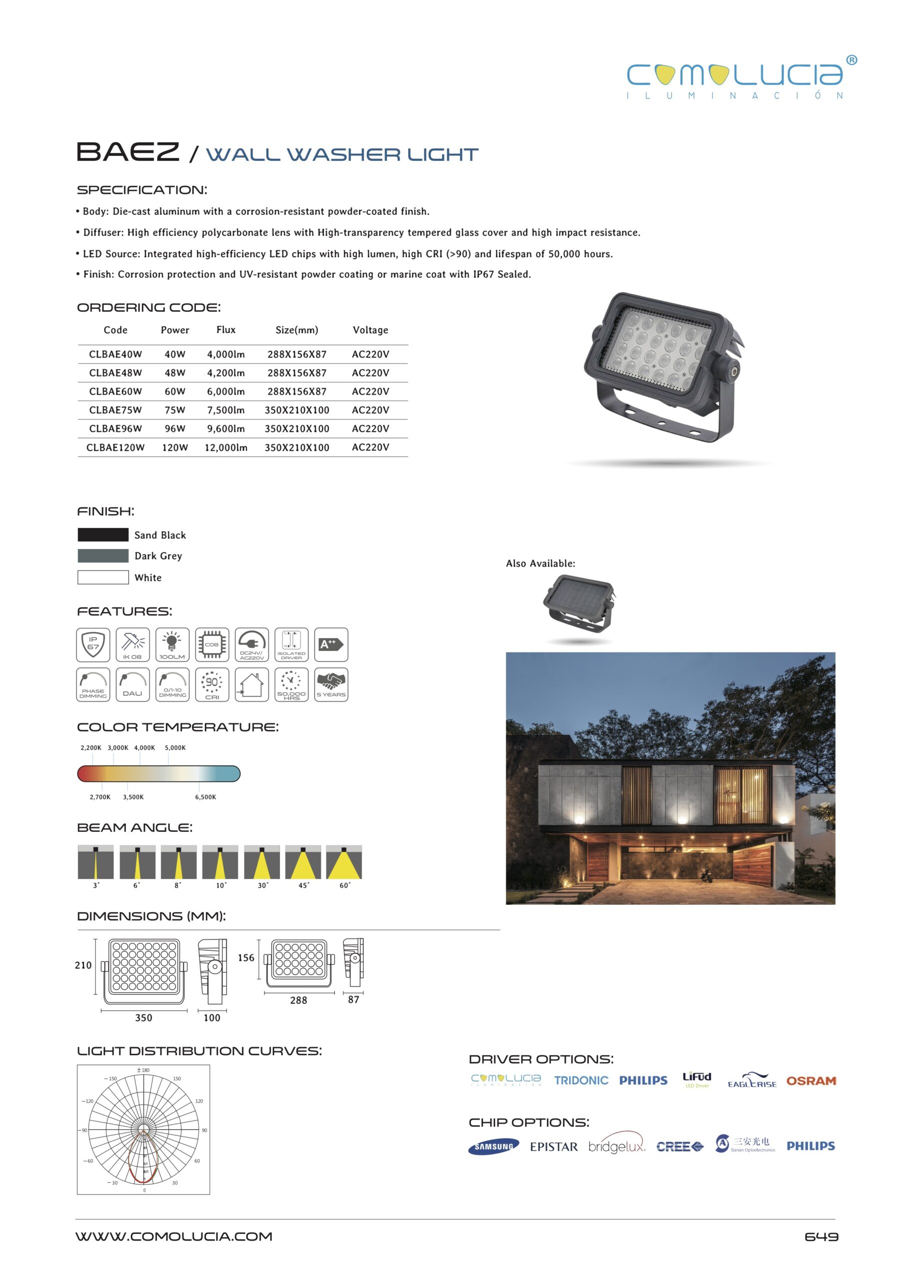 - LED Source: Integrated high-efficiency LED chips with high lumen, high CRI (>90) and lifespan of 50,000 hours.