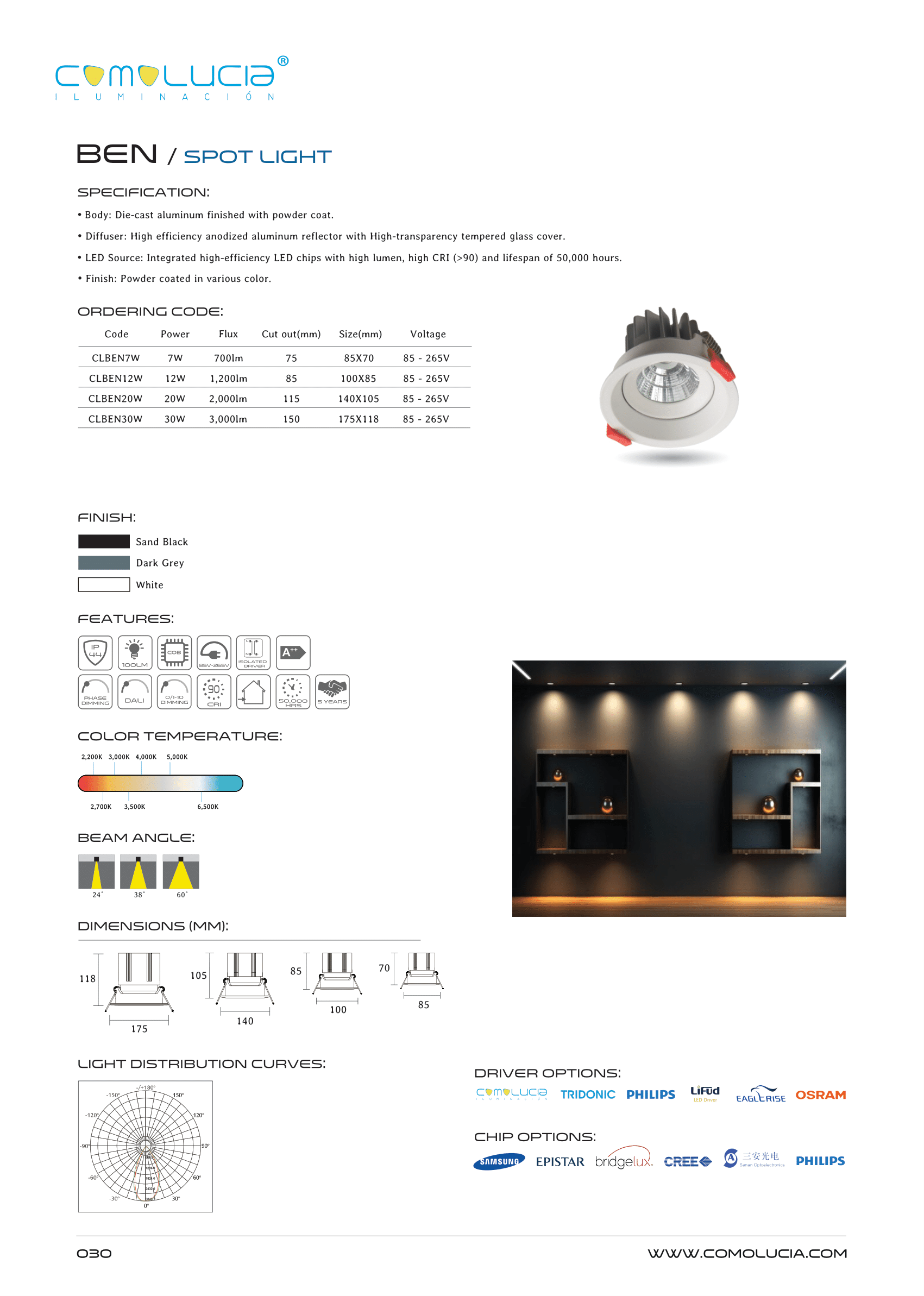 - LED Source: Integrated high-efficiency LED chips with high lumen, high CRI (>90) and lifespan of 50,000 hours. Finish: