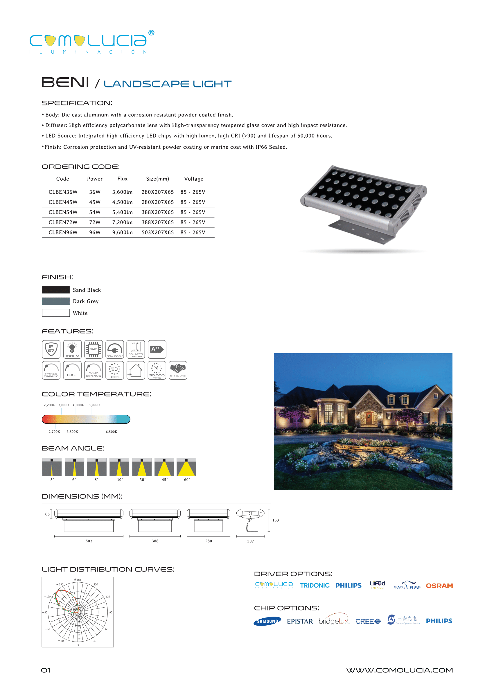 - LED Source: Integrated high-efficiency LED chips with high lumen, high CRI (>90) and lifespan of 50,000 hours.