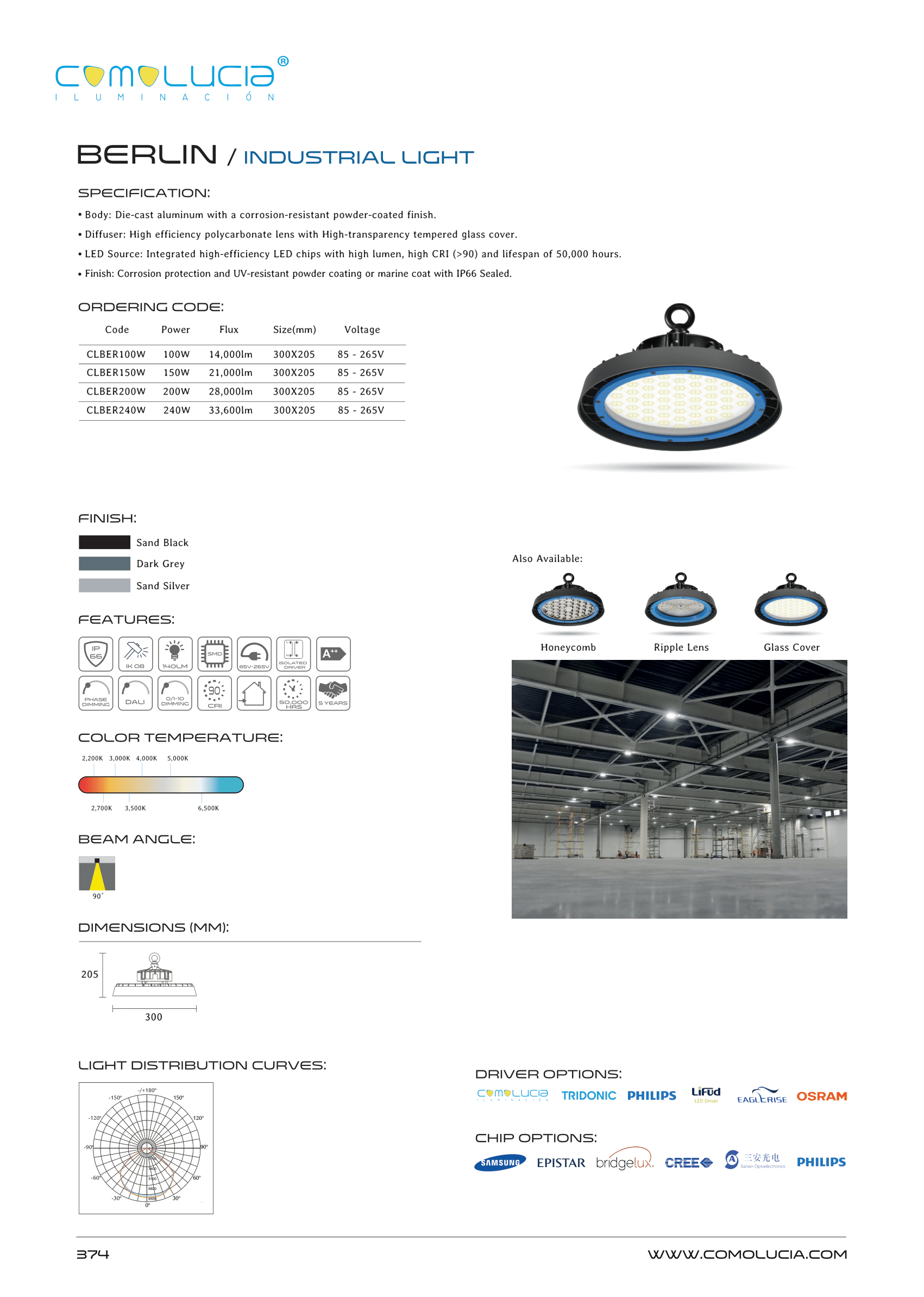 - Diffuser: High efficiency polycarbonate lens with High-transparency tempered glass cover.