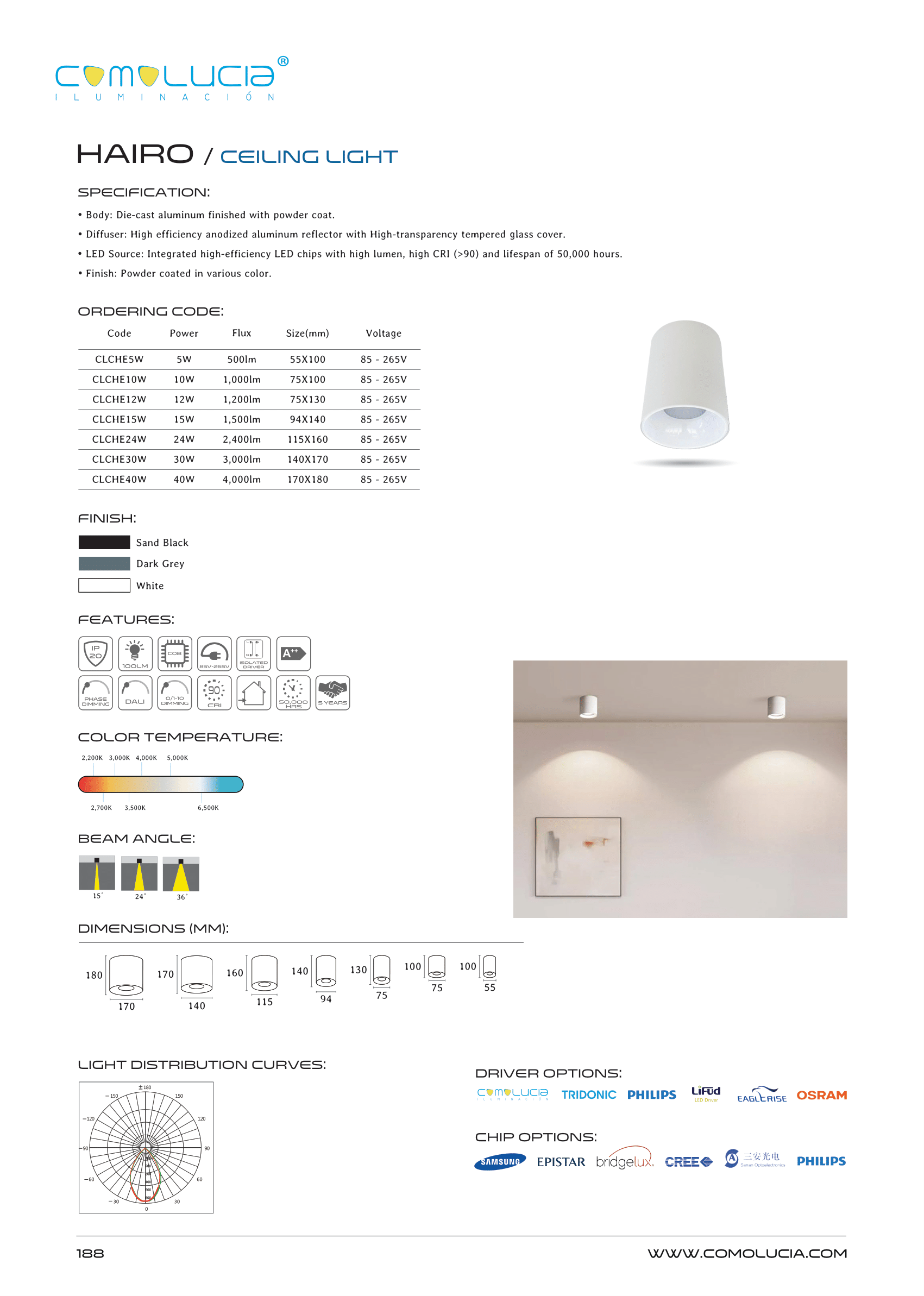 - Diffuser: High efficiency anodized aluminum reflector with High-transparency tempered glass cover.