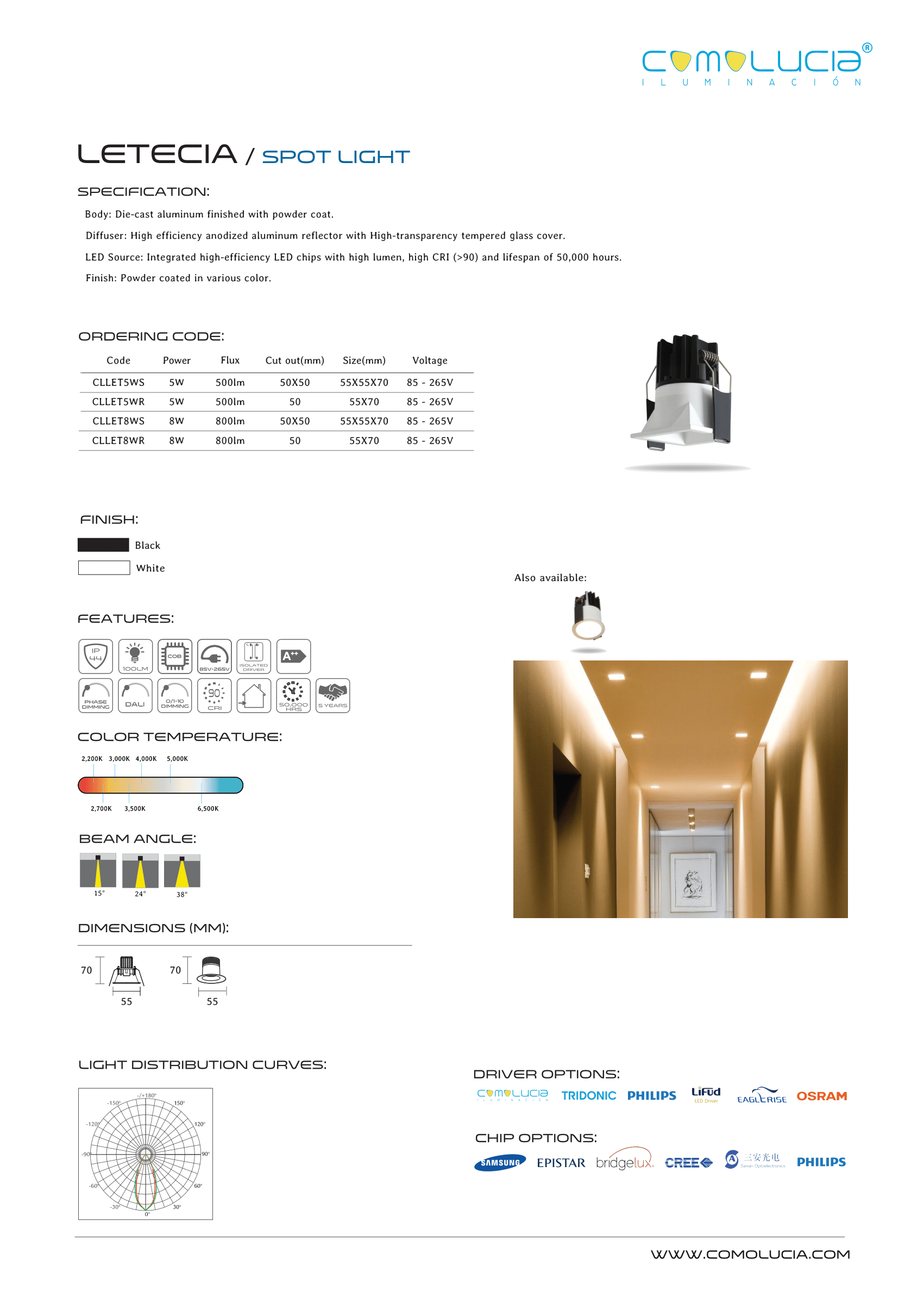 - LED Source: Integrated high-efficiency LED chips with high lumen, high CRI (>90) and lifespan of 50,000 hours.