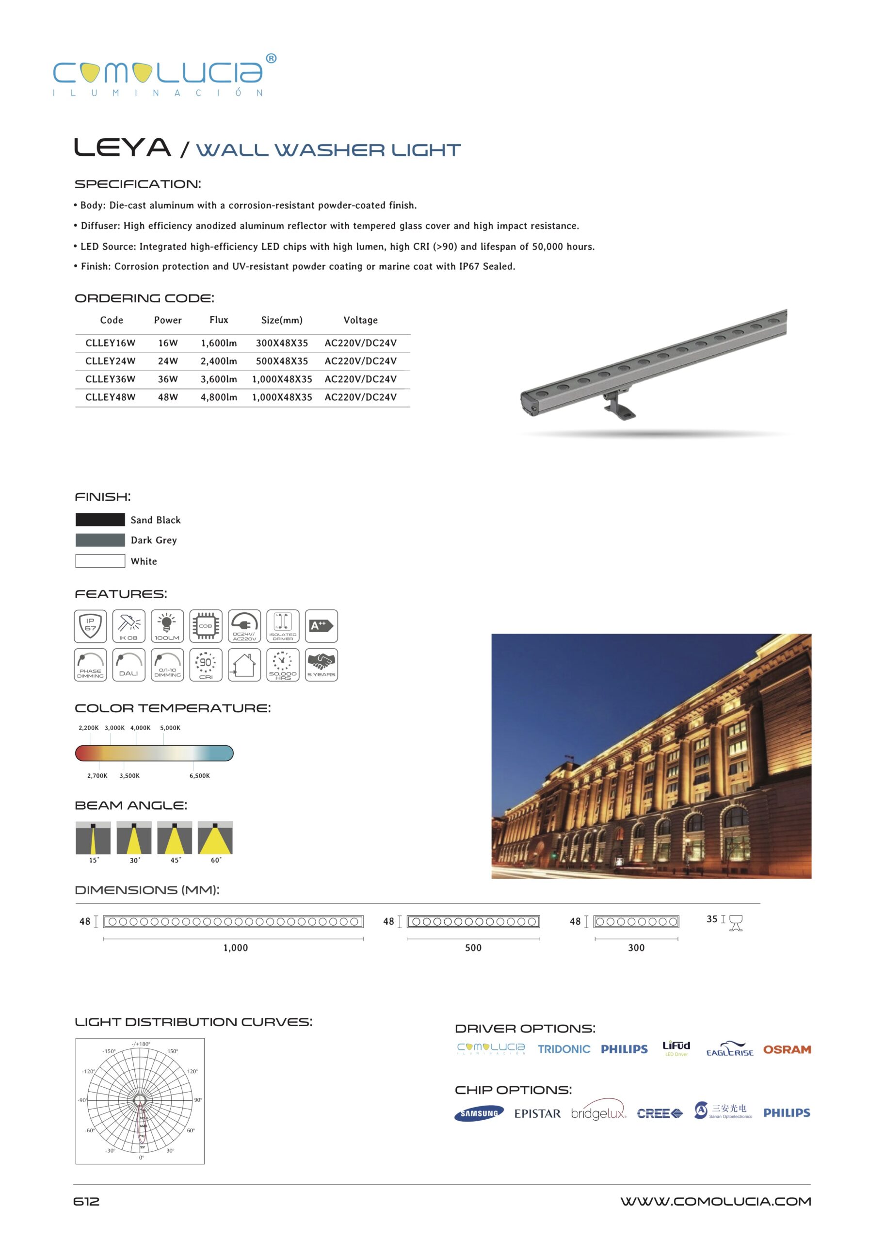 - LED Source: Integrated high-efficiency LED chips with high lumen, high CRI (>90) and lifespan of 50,000 hours.