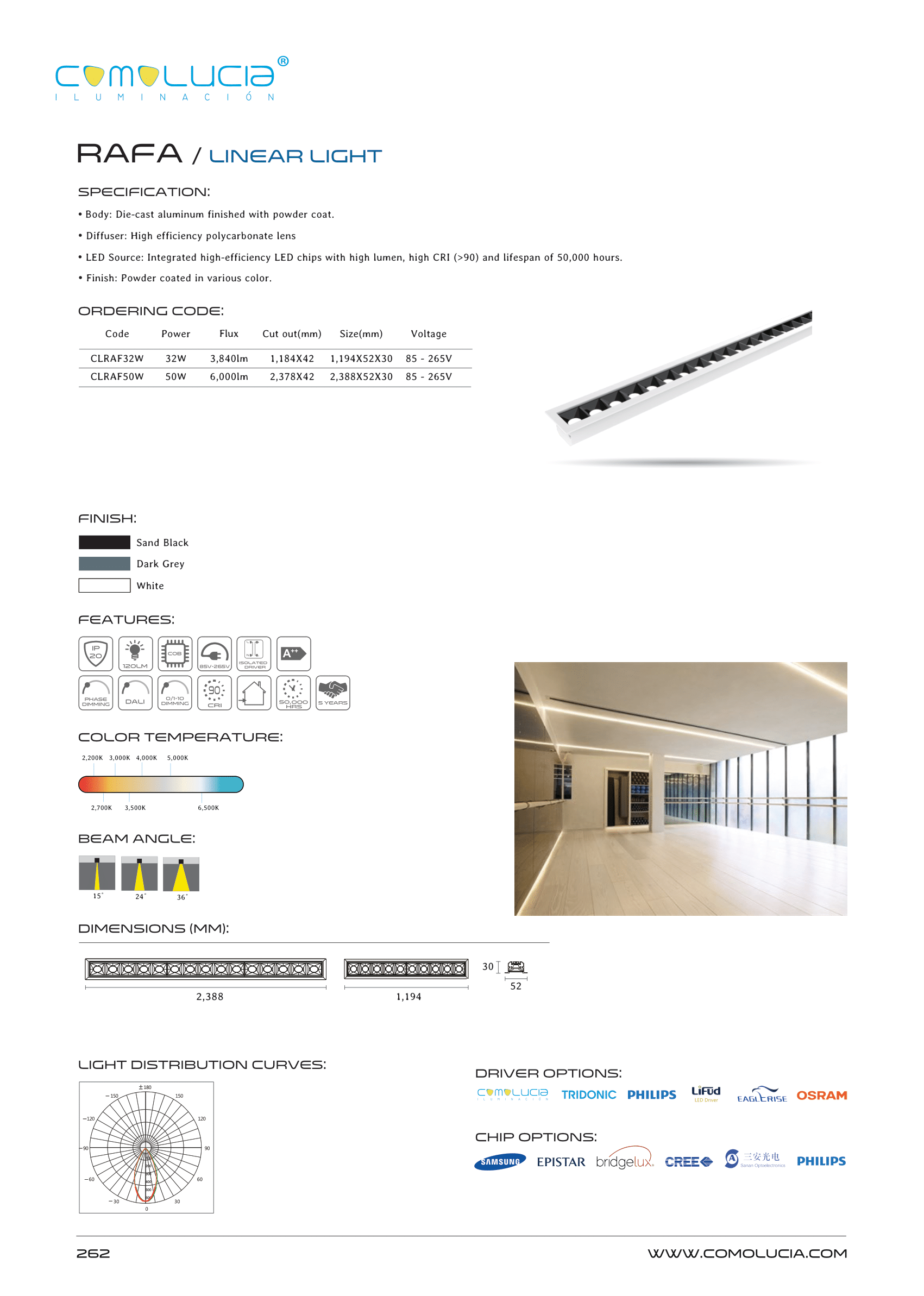 - LED Source: Integrated high-efficiency LED chips with high lumen, high CRI (>90) and lifespan of 50,000 hours.