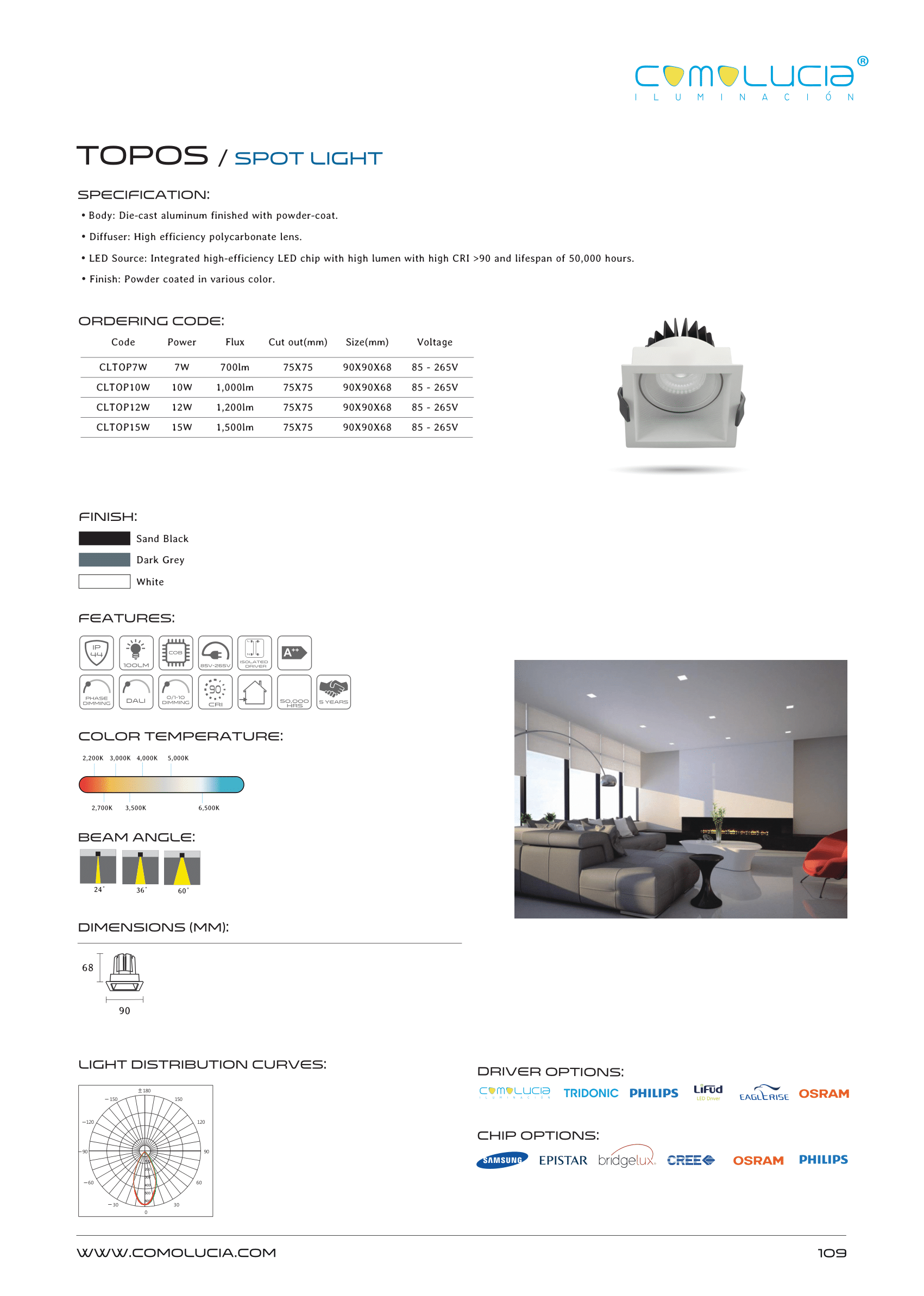 - LED Source: Integrated high-efficiency LED chip with high lumen with high CRI >90 and lifespan of 50,000 hours.