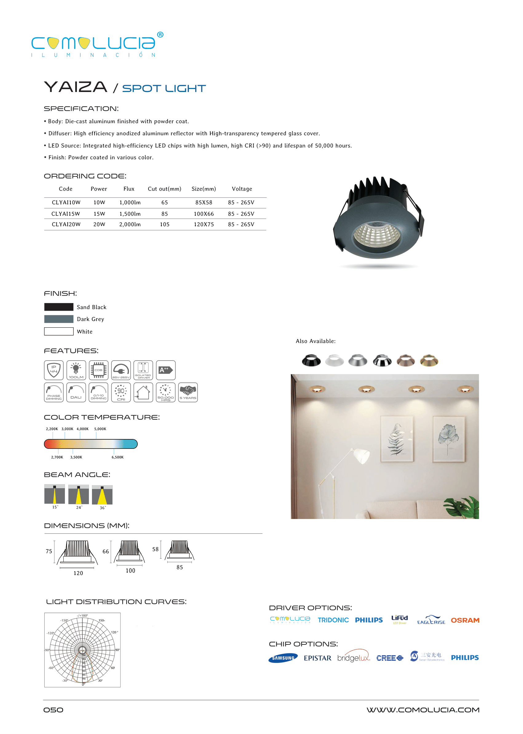 - LED Source: Integrated high-efficiency LED chips with high lumen, high CRI (>90) and lifespan of 50,000 hours. Finish: